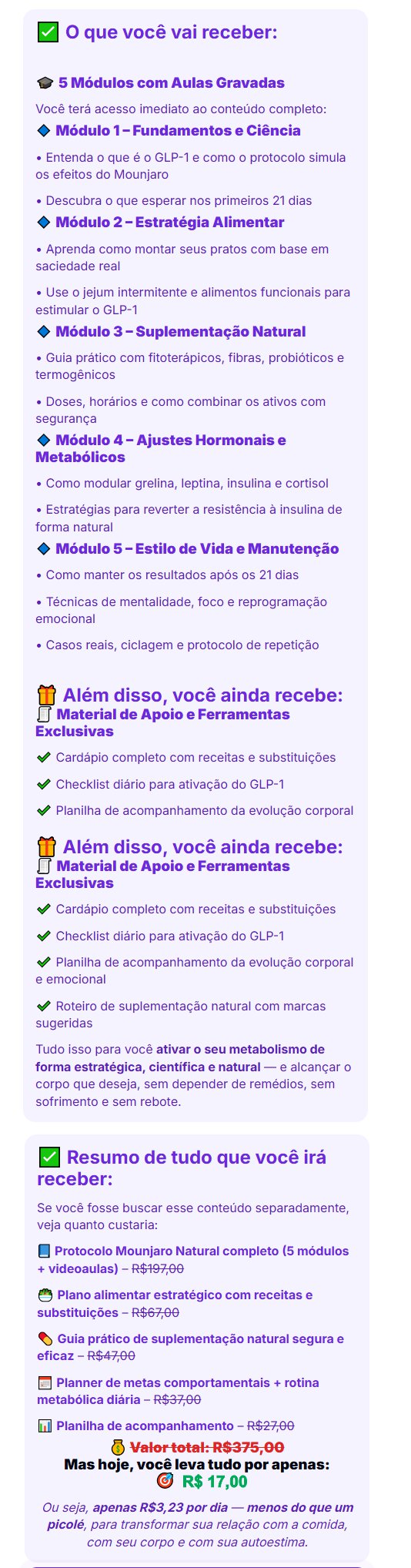 Eu já tinha tentado de tudo para emagrecer, mas nada funcionava. Depois de iniciar o Protocolo Mounjaro Natural, perdi 11kg em poucas semanas! O mais incrível é que minha fome e ansiedade diminuíram naturalmente, obrigada Dr Stevan por entregar tanto!